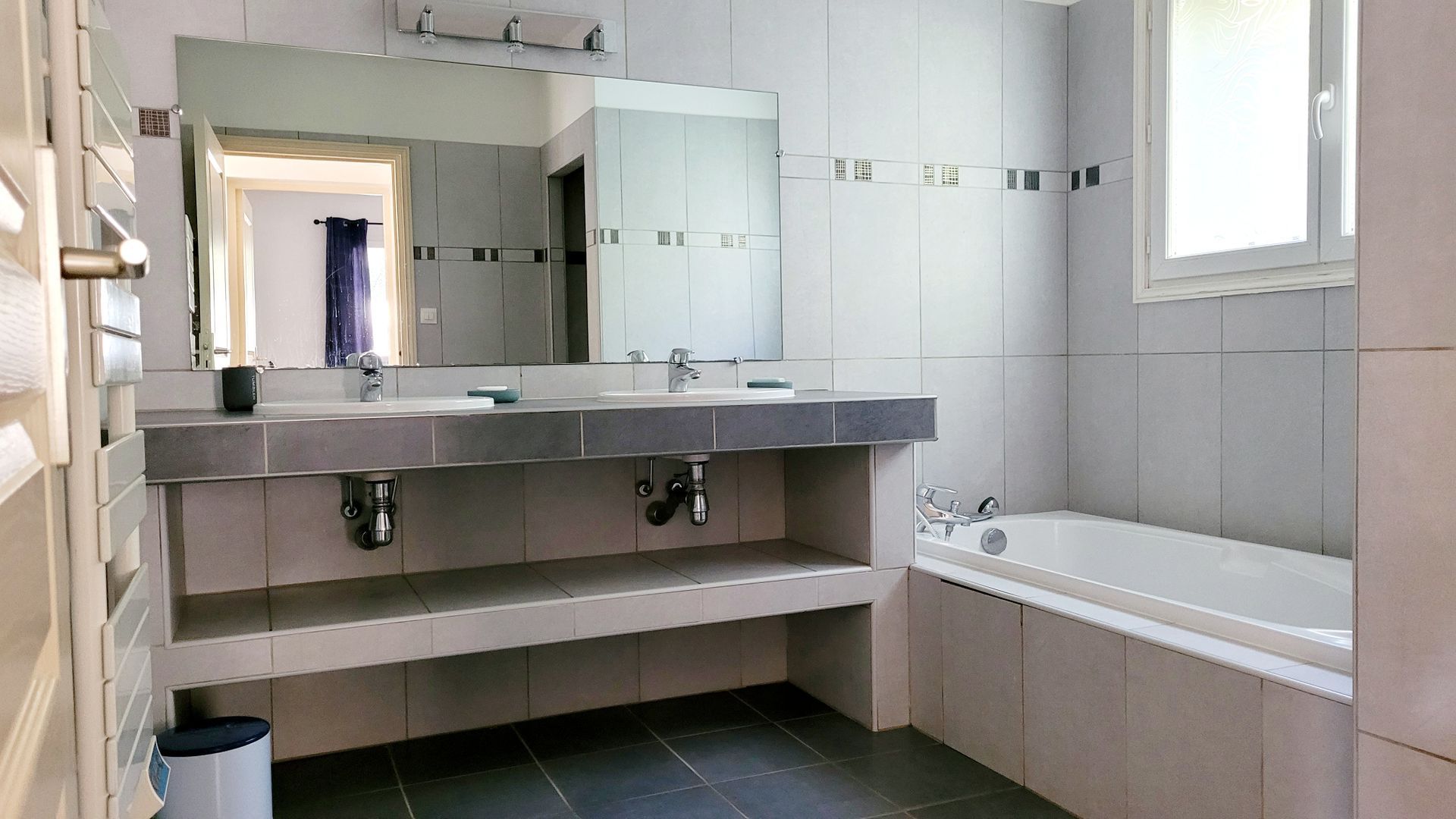 Grande salle de bain avec baignoire et douche, 2 vasques et sèche serviettes